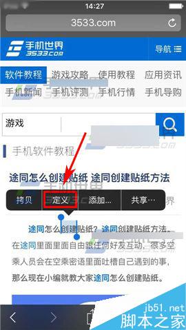 1)以点击【Safari】为例,进入网页后长按需要翻译的文字,然后点击弹出来的提示菜单中的【定义】。(PS:你也可以打开短信或者备忘录,选择文字即可)(如下图)