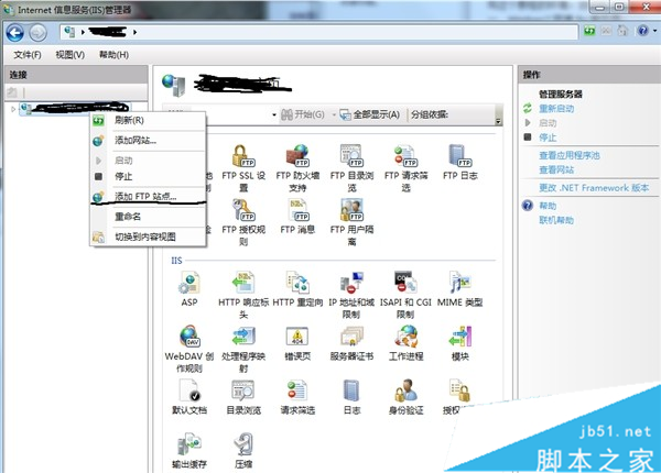 3、点击左边那一栏,右键-添加FTP站点。FTP 站点名称可以随便起,物理路径则选择你想要在iPhone/iPad上访问的磁盘或文件夹。