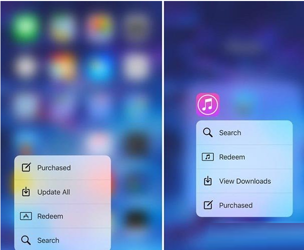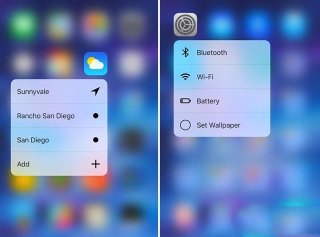 应用图标快捷操作—— iPhone 6s 和 iPhone 6s Plus 支持全新的 3D Touch 应用图标快捷操作功能,现在包括天气、设置、指南针、健康等应用都支持快捷菜单功能。设置应用支持快速访问蓝牙、WiFi、电池和壁纸。健康应用支持快速访问医疗急救卡、图表汇总等。指南针应用可以直接打开指南针或水平仪。