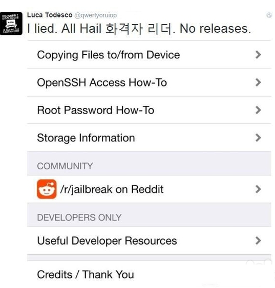 不久之前,开发者 Luca Todesco(推特名 @qwertyoruiop)曾放出了一张令人兴奋的截图,其中显示 iOS 9.2.1 已经被成功越狱。然而就在众人期待他尽快放出工具时,这位开发者似乎慌了,他随即在推特上又发布了一则消息,声称此前的越狱截图是来自于韩国的开发者,并不是他自己的,为此他还对公众道了歉。