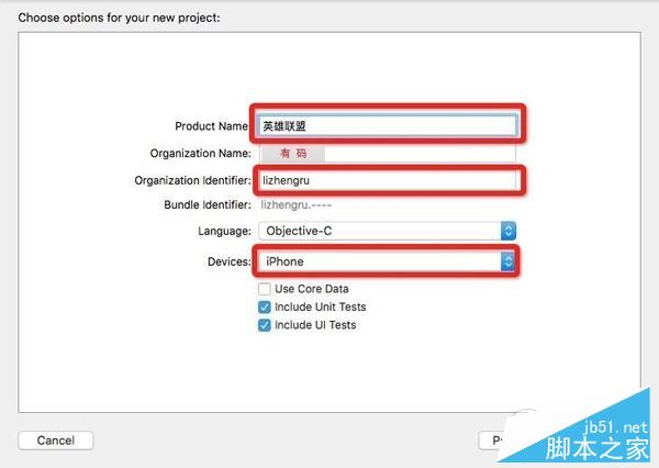 4、输入项目名称(Product Name)、公司标识前缀名(Organization identifier)、开发语言(Language)和设备(Devices),并点击下一步,然后选择工程保存的地方,点击 Create。