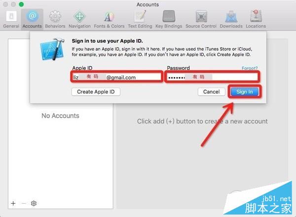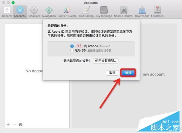 5、修复代码签名问题,添加 Apple ID,已经开启两步验证的锋友需要验证一下,添加完成后如下图,关闭 Accounts 窗口,提示 Reset 的,请点击 Reset,不提示的请忽略此步,至此,代码签名问题已修复。
