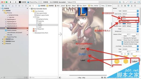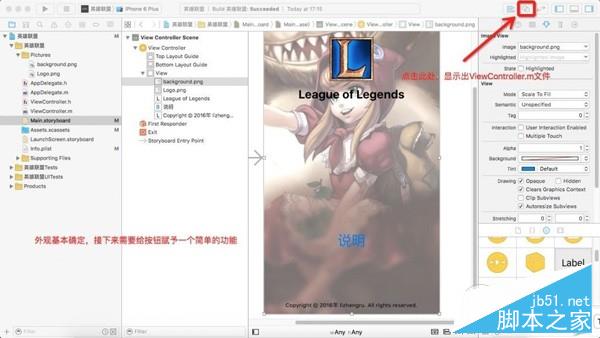 7、修改 View Controller 属性,添加图像视图,拖入 Label 和 Button 控件并适当修改其外观属性。