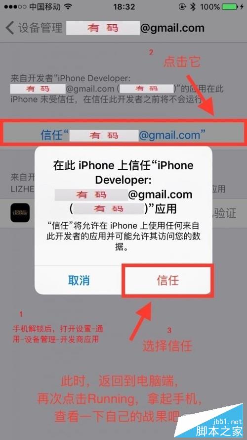 10、此时程序已经安装在手机里面了,但是得不到系统的信任,现在要做的就是在 iPhone 手机上解锁屏幕,前往设置 - 通用 - 设备管理 - 开发商应用,信任你的 Apple ID,然后再次点击 Xcode 里的 Running。这样一来,我们就已经成功的完成了开发一个完整的程序,试着点击它吧。