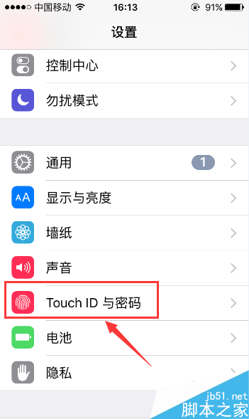 1.首先我们点击苹果手机的“设置”功能,然后再在“设置”页面找到“Touch ID与密码”按键,点击该按键。