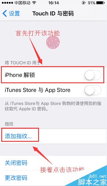 苹果手机一般大家都通过输入密码来进行解锁屏幕,但是这也有个缺点,就是万一我们把解锁密码忘记了,这样就导致无法解锁屏幕了,苹果手机提供的指纹解锁功能,这点非常的人性化,只要我们设置了解锁的指纹,通过按住“主屏home键”,这样就可以达到解锁屏幕的效果,那么苹果手机指纹解锁怎么设置呢?下面脚本之家小编带领大家一起学习苹果手机设置指纹解锁的方法。