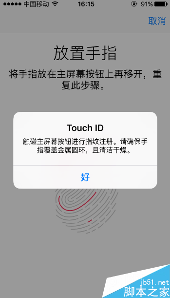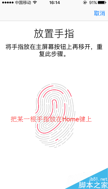 5.接着屏幕会出现“放置手指”的页面,我们根据自己的习惯任一把自己的某一根手指放在Home键上。