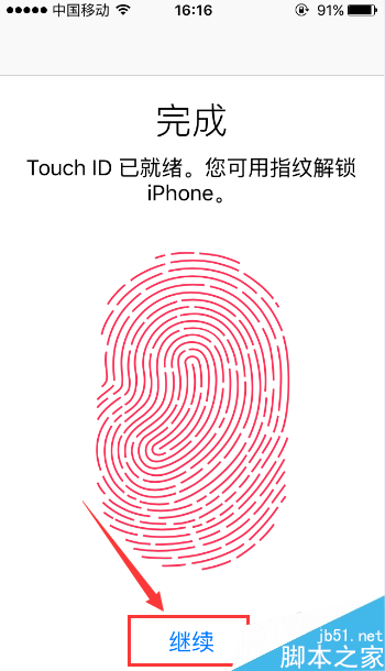 7.当指纹输入完成后,手机屏幕会出现完成的页面,我们点击页面中的“继续”按键。
