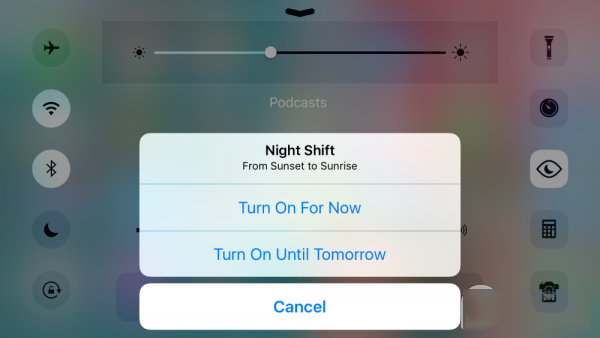 在iOS9.3第二个测试版中,苹果在控制中心加入了“减弱蓝光”功能快捷开关。减弱蓝光的图标是眼睛形状,在计时器和计算器中间。点击之后,有暂时打开和明天前保持打开选项。