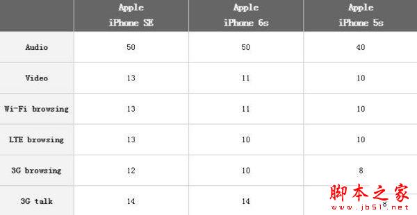 具体而言,在上网和播放视频的情景中,iPhone SE续航相比iPhone 6s有着高达30%的提升,而在播放音乐和3G通话测试中,两者续航时间打了个平手。当iPhone SE和苹果5s对决的时候,前者展现出了压倒性的优势,在各项目测试中几乎是全面压制。