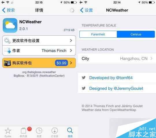 插件不仅可以显示当前的天气状况,还可以显示未来数小时以及数天内的天气情况,包括最高温以及最低温。在其他插件开始在酷炫的视觉效果上下功夫的时候,插件依旧延续了简洁明了的理念,简单的设置之后用户可以获得最直接的信息。对于喜欢简洁的用户或者对于耗电量比较在意的用户,这款插件是一个不错的选择。插件在Cydia当中售价0.99刀,对于iOS 7和iOS 8系统已经完成适配,用户可以放心使用。