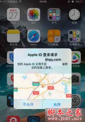 10.这时候手机多了一个提示,当前的Apple ID 登陆请求,不过有时候显示的地位很不准确!(手机已经开启定位)小编现在的位置显示另一个城市了。