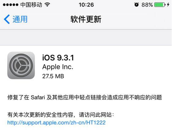 上面说到,iOS9.3.1只是一个救场的系统,为了修复iOS9.3 在Safari浏览器中点击内链导致应用崩溃的bug,苹果直接推送了iOS9.3.1系统,对于在iOS9.3中遭遇该bug的用户来说,第一时间升级显然是王道,不过对于没有遭遇该bug的用户来说,升级的意义并不是太大。