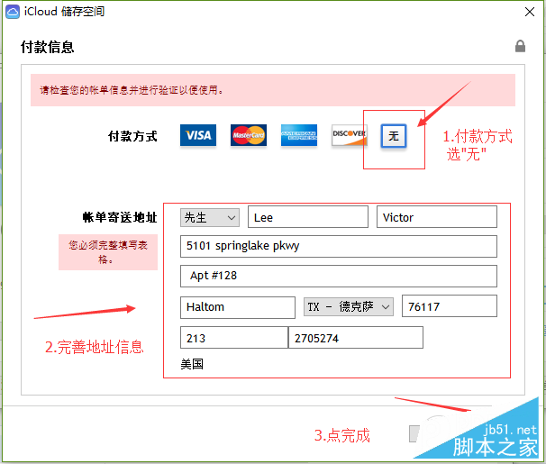 3. 选择你想要修改的国家或地区,点击“更改”,然后你就会发现付款信息可以选择“无”,完善地址信息,完成。而在“账单寄送地址”中,选择的地区和邮编要对应,否则可能会失败,电话号码和街道地址则没有太多要求。
