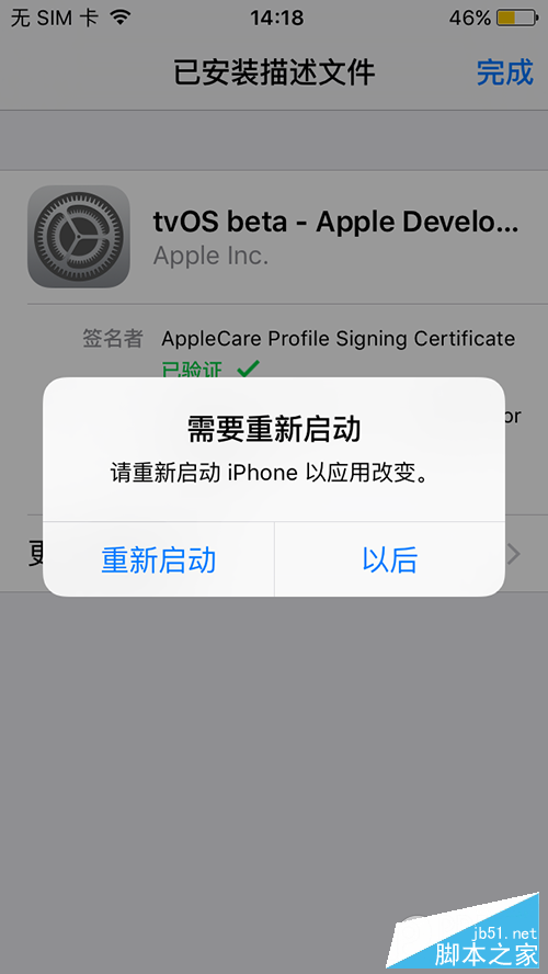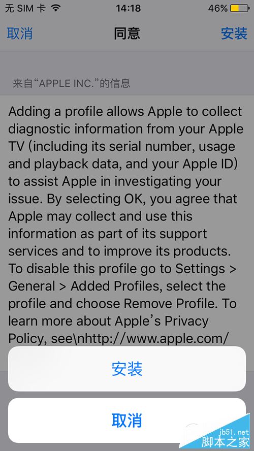 2、按照提示安装描述文件,安装完成后重启手机即可。