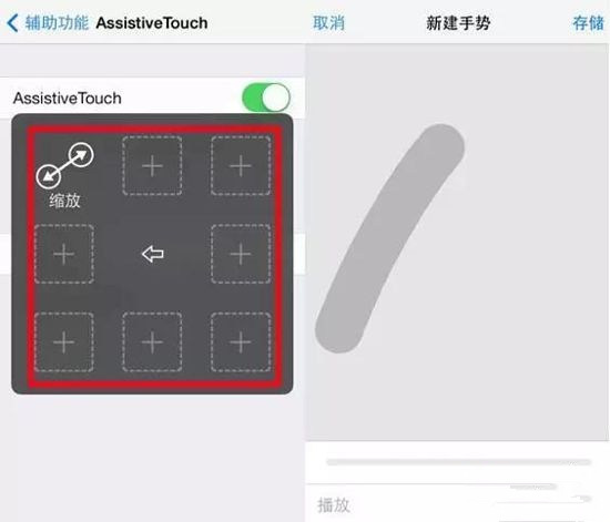 小圆点中的【自定】快捷键,默认有两个手势功能:一是缩放;二是双击。除了这两个以外,还有6个手势功能可以自定义添加。只需要点击【自定】中的加号框就可以新建手势。新建手势后,就可以在Assistive Touch中更改手势数字或添加新建的手势了。设置成功后点击手势图标,选择对应手势后,点击屏幕就能出现对应数字的手指触屏使用。