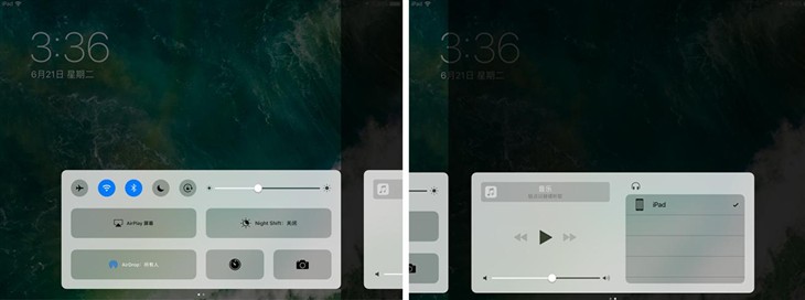 至于控制中心的功能性也有变化——将音乐播放功能单独分了出去,形成了可以左右滑动的两个页面,按键也变得更有色彩,便于区分是否打开(飞行模式背景为黄色、勿扰模式背景色为紫色、旋转锁定按键背景色为红色);音乐播放界面也没什么可介绍的,我们只要知道它和以前一样支持第三方应用就好了(因为我们升级的系统为开发者版本,所以控制中心的左右滑动会有深色的背景BUG)。