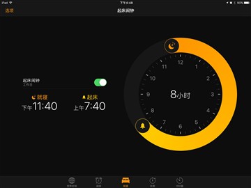时钟应用的整体背景颜色都变成了暗黑系,多出了一个就寝的选项,它和闹钟没什么关系,主要的功能是保证我们的睡眠,开启后只要输入我们希望起床的时间、睡觉的时间、睡前几分钟提醒、提醒铃声等几步的设置就能成功开启。它会在晚上提醒我们该睡了,早上自动叫醒。
