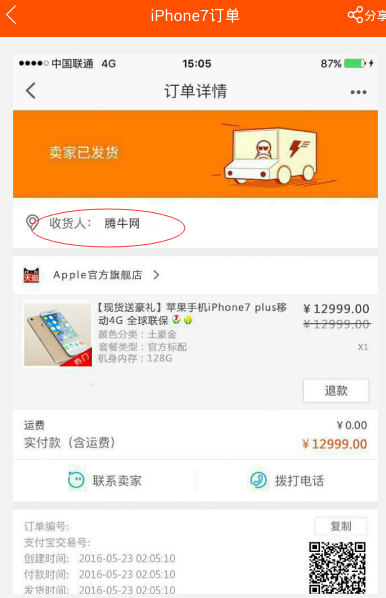 4、这个时候,你的iPhone7订单图片生成成功啦!苹果还未发布iPhone7,我们就有了淘宝订单,这逼装的太给力了!