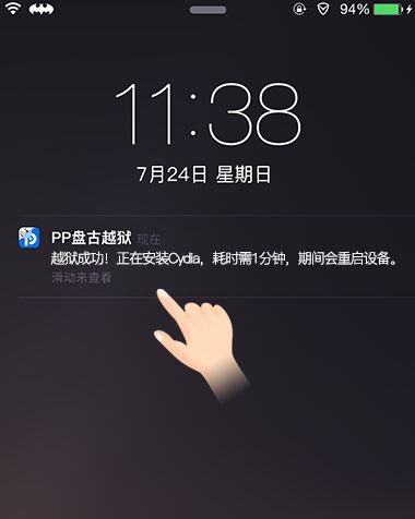 6、收到越狱成功后的消息后,请稍等待1分钟,PP盘古越狱工具将为您安装Cydia,
