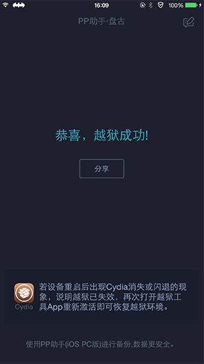温馨提示 :若设备在重启后出现Cydia消失或闪退的现象,说明越狱已失效,此时再次打开PP盘古越狱工具进行一次越狱操作即可恢复越狱。