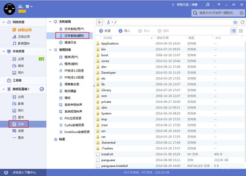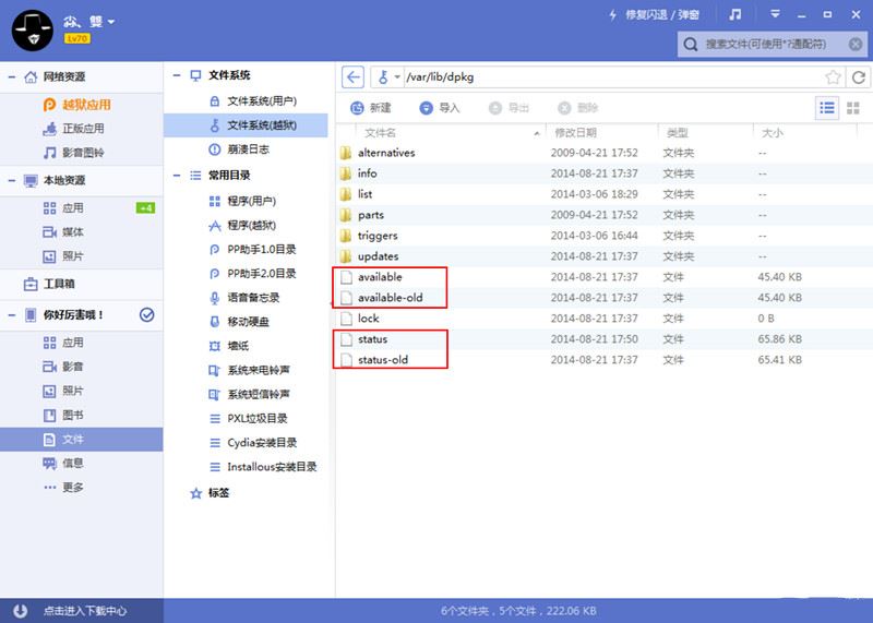 经过测试之后,发现可以通过使用电脑端的pp助手修改设备上 /var/lib/dpkg/ 下文件名来修复此问题,需要修改的文件有这四个:“available,status,available-old,status-old”。修改的方法如下,先将设备连接电脑端的pp助手,然后点击设备栏上的【文件】-【文件系统(越狱)】:
