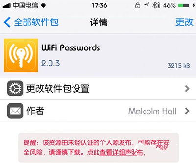 自从升级到ios9.3.3系统,越狱后,发现原来的wifi****闪退,用不了,后来添加源之后,wifi****不闪退,可以使用,但是又发现wifipasswords,不能记录wifi****破解的密码,原因是wifipasswords版本升到3.0以上,就不能记录破解的密码了,要安装2.0.3版本的wifipasswords,就能记录破解的密码了。ios9.3.3能用的wifi****:先添加源:http://apt.so/6597266,再找到wifi****2.3版本安装就可以了。wifipasswords2.0.3版本安装:先添加源:http://apt.so/mysource,找到wifipasswords2.0.3版本,安装好,ok,再看看wifi****破解的密码是不是有了。