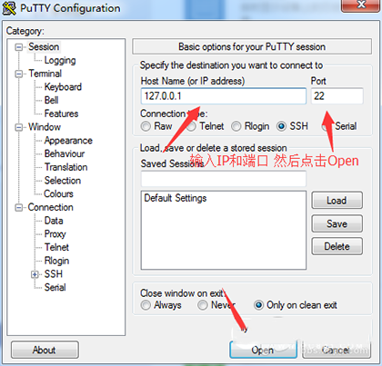 第三步:打开PuTTY(输入IP和端口然后点击Open)