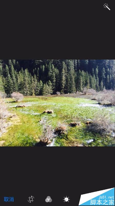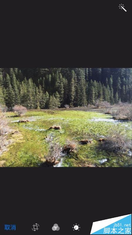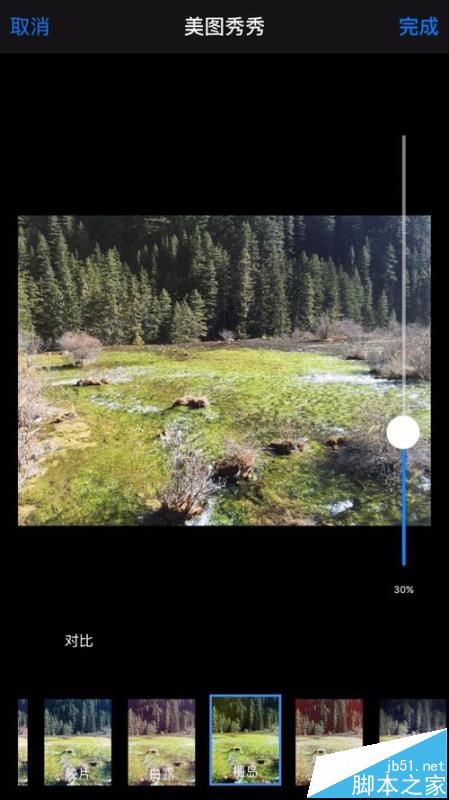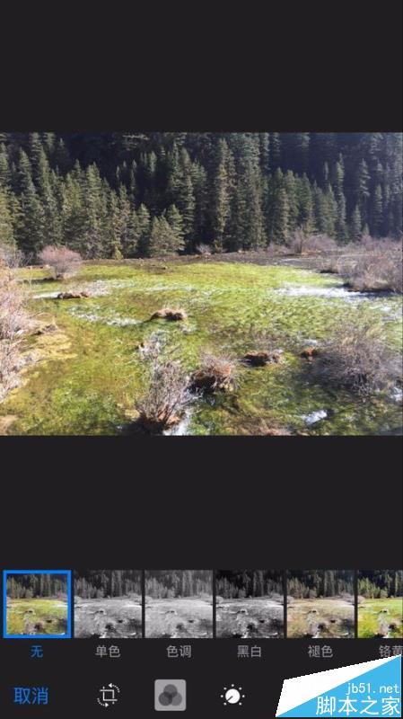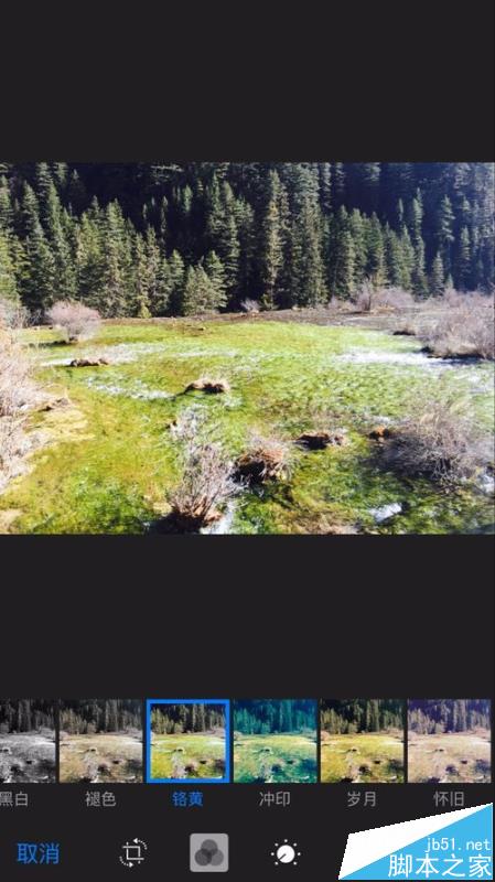 4、苹果手机自带的滤镜效果不多,拖动滤镜条后,一般风景类的推荐铬黄效果,色彩搭配挺不错的。