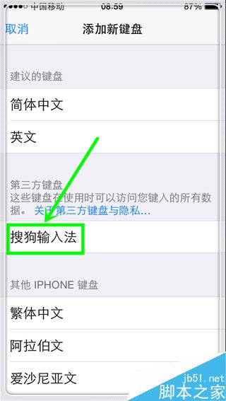 然后,在已添加的键盘中点击搜狗输入法,打开“允许完全访问”。并选择“允许”第三方访问个人隐私。(当然不用担心信息泄露啦)