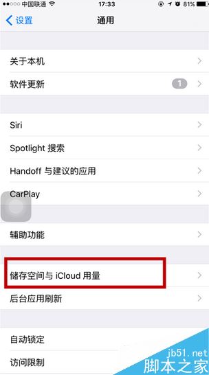 点击后,往下滑动屏幕,选择辅助功能下方的储存空间和iCloud用量选项,点击进入。