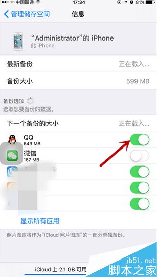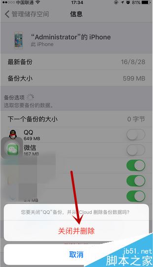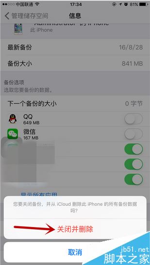 我们可以先选择关闭一个小项。因为如果直接点击删除备份的话,可能系统不允许,所以先点击一个。
