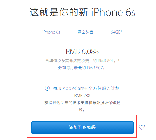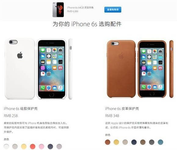 ▼ 在选购页面,可以选择机型、颜色、以及容量大小,感谢国行全网通,国内消费者不必选“运营商”一项了。在以上选项选择完成之后,也可“添加AppleCare+全方位服务计划”,如无需AppleCare+可直接点击“添加到购物袋”,加入购物袋之后会跳转到一个配件推荐页面,可以在此选购官方手机壳、耳机、充电基座、数据线等配件,如无需配件,则直接点击“查看购物袋”。