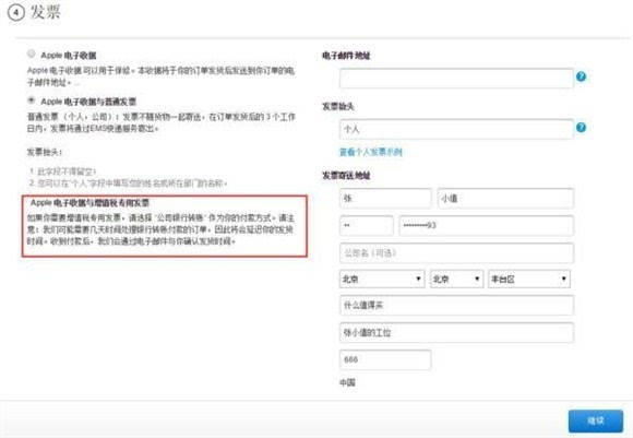 ▼ 选择适合自己的支付方式之后点击“继续”进入发票信息页面,苹果官方在线商店提供标准发票、个人/公司的增值税普通发票等发票提供,视需求选择并填写抬头即可。如需要开增值税发票,必须以“公司银行转账”方式来支付。