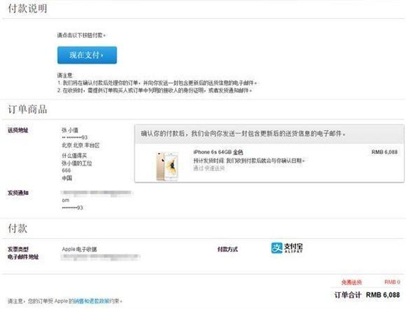 ▼ 在下单完成之后,如果选择的是信用卡在线支付、支付宝等非货到付款方式,那么您还需要进入最后付款环节,网友们也可选择货到付款方式购买来节约下单时间。在最终付款完成之后您就将成功预定您的新iPhone,同时注册Apple ID的邮箱也将会收到来自苹果中国线上商店的确认邮件。