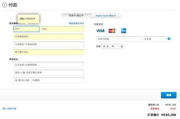 由于苹果香港官网并没有语言障碍,所以选购与付款流程就不一一赘述了,这几个关键点需要网友们注意,繁体中文和英文填写姓名与地址,使用Visa、MarsterCard和美国运通的信用卡来支付。