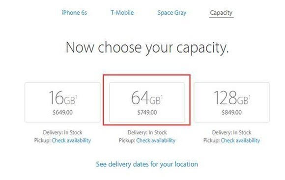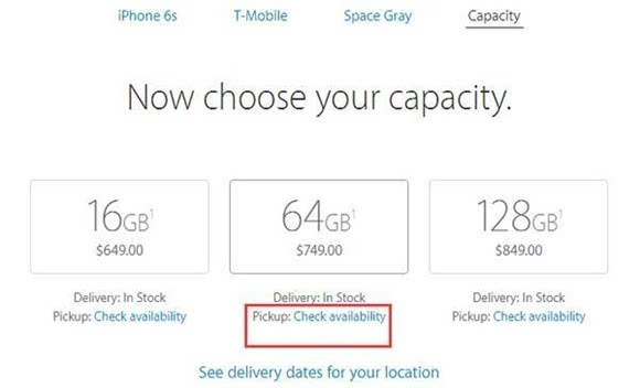 ▼ 而在运送方式上, 苹果美国在线商店支持快递与自提两种方式,默认的方式是快递配送,各位网友可根据自身情况选择,当然 走转运的话一定要选“Delivery(快递配送)”。在选择容量这一步时点击下方的“Pickup: Check availability”就可以查看支持自提的店面,身在美国或者托朋友带回的可以选择这一项。