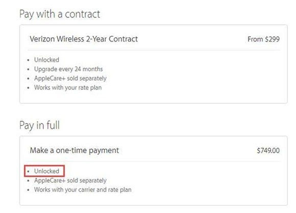 ▼一般来说,SIM-free版的iPhone不会第一批开卖,所以首发抢购时仅有运营商型号可选,这时候就得注意避开合约和有锁机了,在选择合约时,请选择“Pay in full”全款购买,并注意“Unlocked”无锁字样。如果今年SIM-free版直接首发,那么请毫不犹豫地选择这个版本。