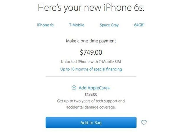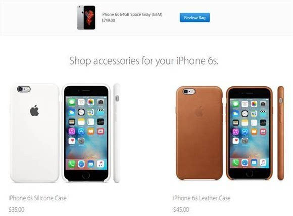 ▼ 选择好需要的型号、颜色、容量和运营商之后,点击蓝色的“Add to Bag”按钮,即将商品加入了购物袋中。美国官网同样也会在此处推荐官方配件,不需要的话,点击“Review Bag”进入购物袋。