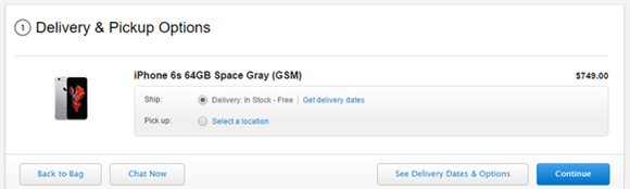 ▼ 进入购物袋后,请检查一遍所选购的iPhone版本型号、颜色与容量,确认无误之后点击“结账”(如之前选购停留时间较长可能需要再次输入账号密码),这时可以看到所选iPhone的预计发货时间和送货地址,点击发货时间旁边的链接可以更改送货时间。然后点击“继续”进入送货地址确认,这里会显示事先填写的运送信息,继续点击“继续”之后就可进入付款环节。