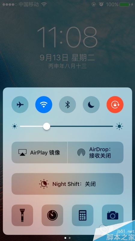 上滑控制中心选择了更为丰富的色彩来提醒用户开关是否打开,并增加了左右滑动切换的两个面板卡片,这导致亮度调节和声音调节分离。