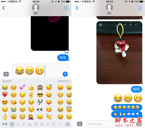 iMessage 中又怎能少了emoji表情,对于emoji表情苹果从未间断过更新,如今在iOS 10中,emoji表情输入时尺寸会相应放大,并且显示的方式变得更加智能化,另外当我们输入某些特定文字时,系统还会自动匹配出对应的emoji表情供用户选择,十分方便。