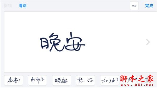 可能你会问手写板去哪了,其实只要你把手机横过来就可以进入手写模式了(或者点选全键盘右侧的按钮),系统预先内置了“晚安”、“加油”、“谢谢你”等手写短语,当然你也可以发挥自己的想象力给对方写点什么,帅气的签名也好,可爱的图形也罢,似乎彼此之间的距离一下子被拉近了。