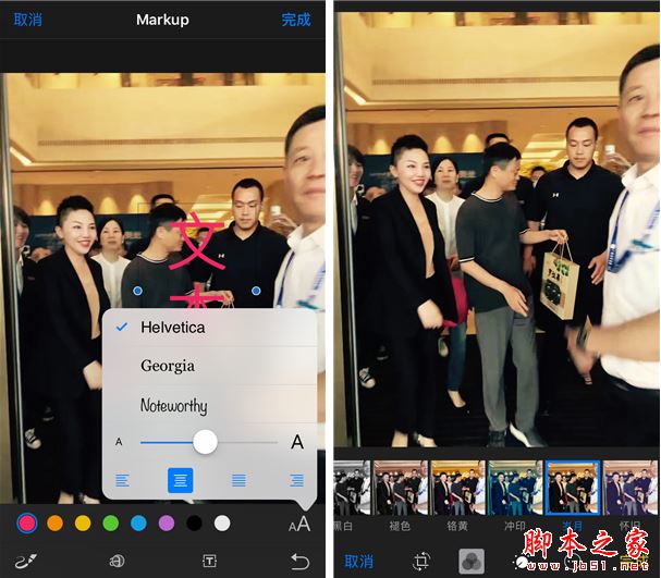 图片编辑方面与iMessage一样附带了“Markup”功能,透过这个功能可以对图片进行涂鸦、添加文字、放大等等,就相当于集成了一个简易的图片编辑APP。