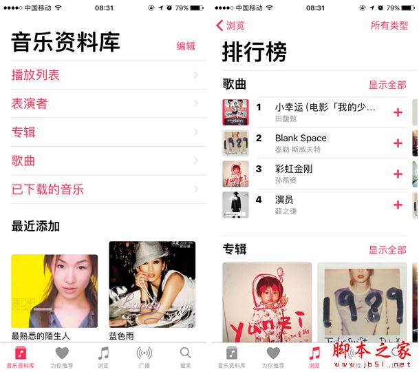 Apple Music打开之后能够明显感觉到界面有了全新的设计,变得更加简约大气,就如苹果在WWDC大会上所说的一样,不论是观感上还是使用上都更注重用户体验。而内容方面依旧是Apple Music每一次更新的重点,iOS10的Apple Music 下方可以看到有“资料库”、“为你推荐”、“浏览”、“广播”和“搜索”五个分区,在资料库中,你会看到所保存的本地音乐,可以根据表演者、专辑等分类进行查看。