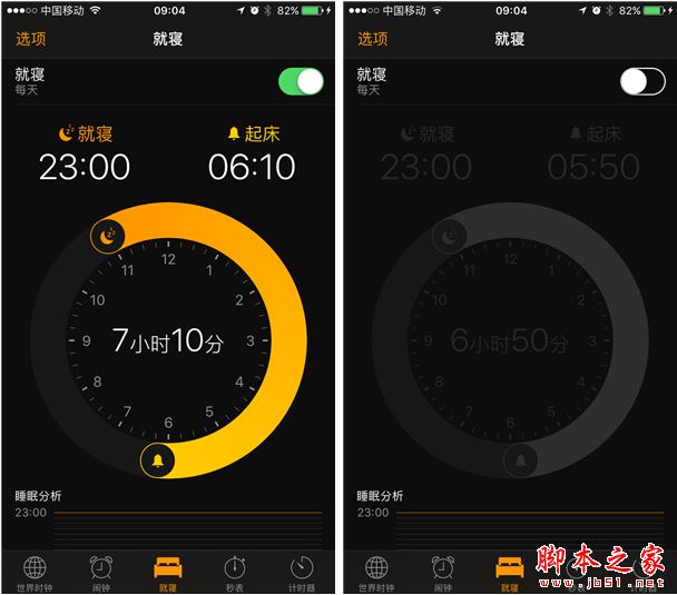 与iOS9相比,iOS10的时钟有了不小的改变,不仅是界面有了变化,iOS 10还多了一个“就寝”功能,直观的表盘显示方式能够让你清楚了解这一天哪些时段应该睡觉,又是从哪一刻起床,允许用户设置每周哪几天开启或关闭“就寝”功能提醒,设置好之后,它会在对应的时间响铃提醒,有了“就寝”功能之后就不用像原来那样设置满满一排的作息闹铃方案了。至于时钟的其他功能,基本保持不变。