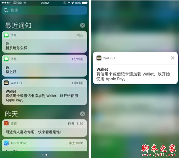 iOS 10可以说最大限度地利用了3D Touch功能,使用3D Touch按压任意一条通知可直接对其进行回复或处理,处理完毕会自动在通知页面删除该通知,如此一来就不用像原来那样来回倒腾查看和回复信息了。在主页面中下滑同样还是Spotlight搜索,Spotlight 现可针对中文和日文提供动态搜索结果。