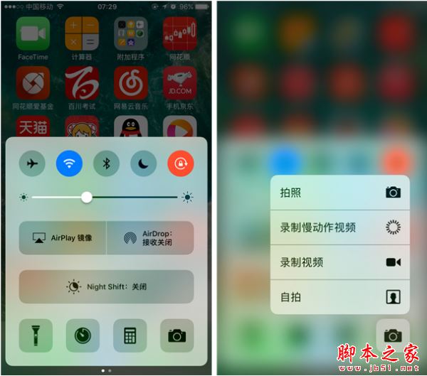 在iOS 10的控制面板中也合理运用了 3D Touch 功能,对着手电筒、相机等开关进行按压时,会额外多出一些功能选项,比如手电筒提供了强光、中等、弱光;而相机则提供了拍照、录制视频等。顺带一提,如果你是在 APP上使用 3D Touch,那么还能进一步显示更多选项,比如快速分享和设置等,这些选项功能会根据不同的APP而稍有改变。