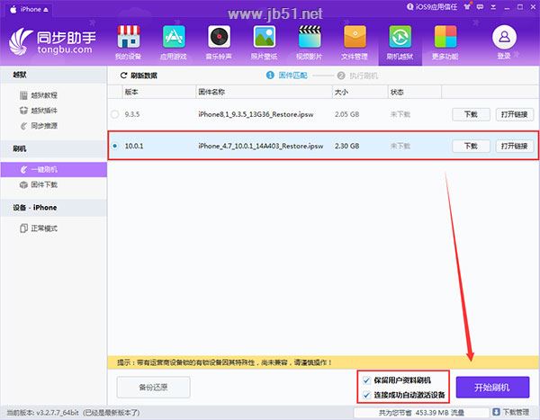 3.跳转到刷机界面后,点选可刷机的固件版iOS10.0.1,勾选“保留用户资料刷机”和“连接成功自动激活设备”,点击【开始刷机】。同步助手会自动完成固件下载到升级的全过程。一般情况下资料能够完整保留,但大版本更新也可能出现资料丢失的情况。