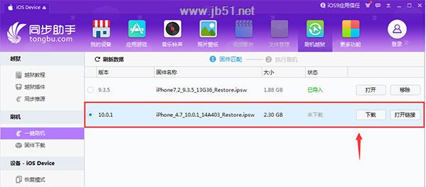 1.根据机型下载好对应的iOS10固件。由于iTunes下载固件的速度较慢,推荐使用同步助手来下载固件。只要切换到刷机越狱界面,同步助手会自动匹配适合你设备的固件,点击下载,完成后点击【打开】就能在本地电脑中找到下载好的iOS10固件。